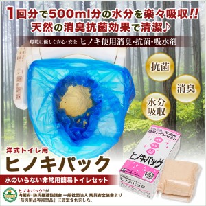 | 備考 | ヒノキパックは水のいらない非常用簡易トイレセットです。 断水時、普段お使いのトイレに簡単にセット出来てご使用になれます。 「ペール缶簡易トイレ」や「ポータブルトイレ」にも同じように使用できます。 |